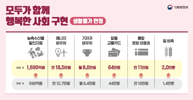 러시아-우크라이나 전쟁과 공급망 혼란이 겹치며 물가 인상과 수급 불안이 지속되는 것과 관련해 정부가 주요 품목 수급·가격 안정, 필수 생계비 경감, 식량안보 강화 등 생활물가 안정에 투입하기 위해 2023년 예산을 5조 5000억 원으로 2022년 4조 7000억 원보다 8000억 원 늘리기로 했다.