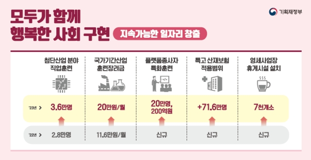 이에 따라 2023년 일자리 예산이 2022년 11조 원에서 12조 1000억 원으로 크게 늘어났지만 일자리 예산 중 정부가 직접 지원하는 직접 일자리와 고용장려금 등은 줄었다. 대신 민간 일자리와 연계한 직업훈련 지원 등을 강화하는 방향으로 내실화를 꾀한다는 방침이다.