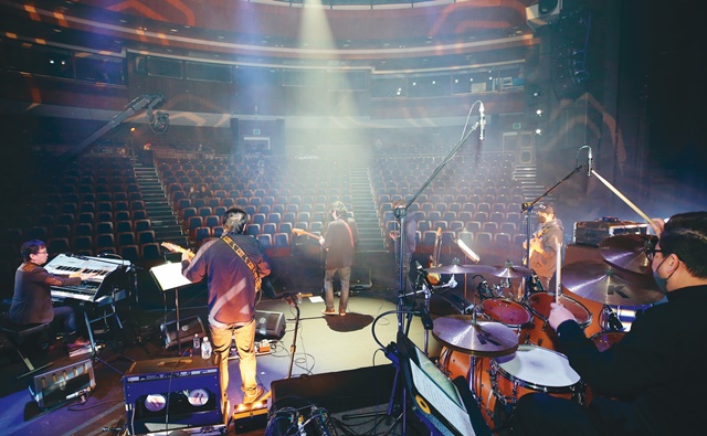 ▶4월 22일 인천시 남동구 인천문화예술회관에서 김목경 밴드가 관객 없이 온라인 생중계로 진행하는 공연을 준비하고 있다.│연합