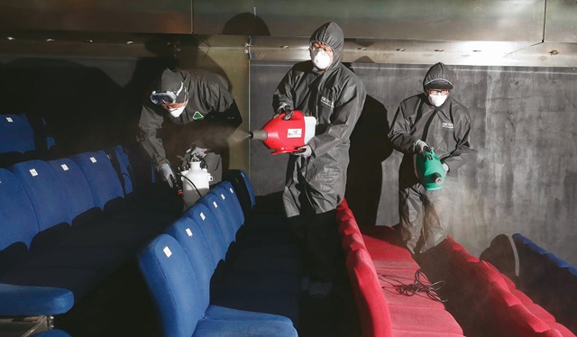 ▶3월 6일 오전 서울 종로구 드림시어터 소극장에서 서울시 관계자들이 방역 소독을 하고 있다.│한겨레