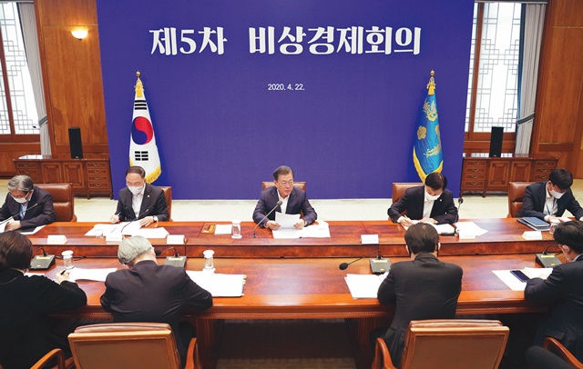 ▶문재인 대통령이 4월 22일 청와대 본관에서 열린 제5차 비상경제회의에서 모두발언을 하고 있다.│청와대사진기자단