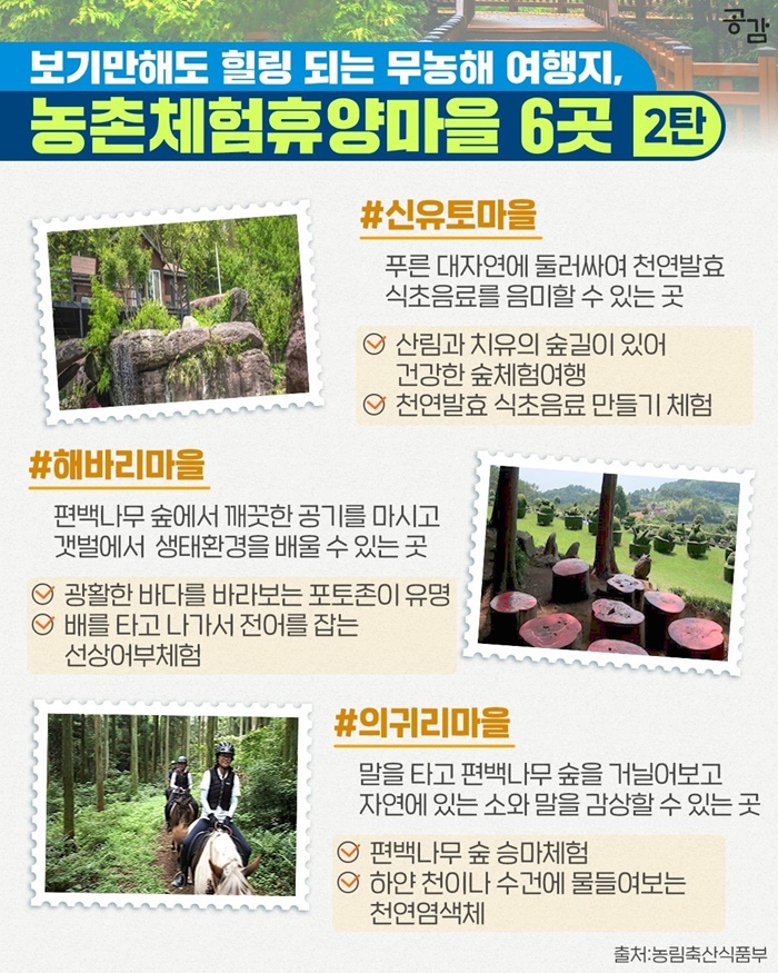 가족, 연인, 친구와 떠나기 좋은 무자극·무농해 여름휴가지는 어디? 친환경 자연을 느끼며 심신 달래는 농촌체험휴양마을 6곳을 소개합니다.