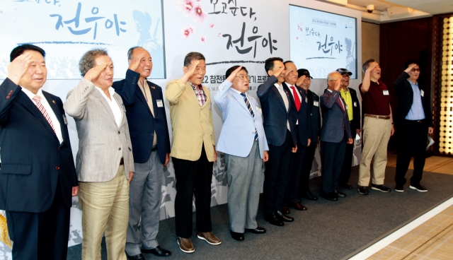 ▶‘보고싶다, 전우야’ 상봉 행사 참석자들이 단상에서 거수경례를 하며 기념촬영을 했다. 김창호, 김봉상, 정대원, 권오천, 김성업 참전용사, 박민식 보훈처장, 이명종, 정창완, 조수현, 이종근, 박세곤, 이승국 참전용사(왼쪽부터)