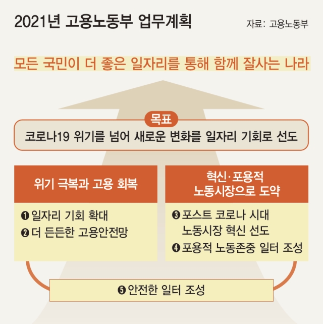 고용노동부가 2021년 30조 5000억 원 규모의 일자리 예산 조기집행을 통해 1분기 중 직접 일자리 83만 명 이상을 채용하고 국민취업지원제도 시행과 고용보험 단계적 확대 등으로 더 든든한 고용안전망을 구축한다. 또한 ‘필수노동자법’·‘플랫폼종사자법’ 제정 등으로 노동존중 일터를 정착시키고, 기업 산재예방체계 구축 지원과 추락·끼임사고 예방 강화로 산재 사망자 수 감축에도 매진할 방침이다. 고용노동부는 이 같은 내용으로 ‘위기를 넘어, 혁신·포용적인 노동시장으로 도약’을 위한 5대 추진과제를 담은 ‘2021년 업무계획’을 2월 8일 발표했다.